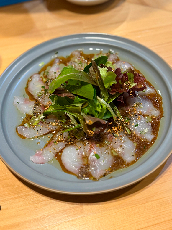 グレーのお皿いっぱいに薄造りにされた白身魚が並び、中央にはベビーリーフやルッコラがふわりと盛り付けられています。醤油ベースのタレに胡麻がたっぷり振られ、黒胡椒のアクセントがピリッと効いていました。