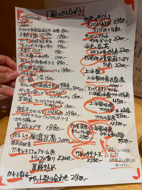赤いマーカーで印がつけられた品書きには、海老のフリットマヨネーズソース、上海蟹料理、白子入り麻婆豆腐、カキとキノコのクリーム煮トリュフの香りなど、心をくすぐるメニューがずらり。お値段は一品1,000円台後半〜3,000円台と、一般的な中華に比べるとやや高めですが、素材のクオリティを考えると十分に納得できる価格設定です。